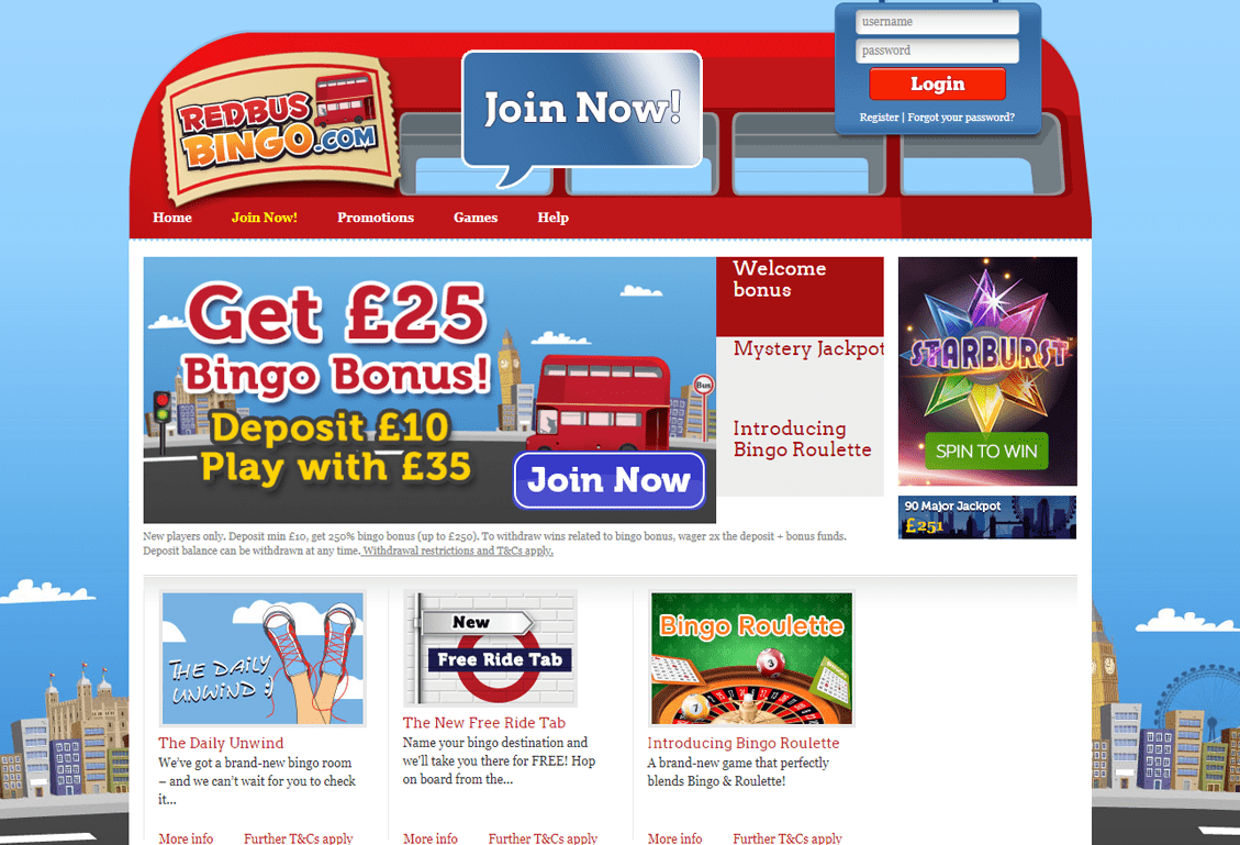In order to find the Red Bus Bingo login section of the site, you’ll just need to look to the right of the logo, where you’ll be able to enter your username and password to gain access to your account. There is a big shiny ‘join now’ button to click if you’re a new player and wish to sign up here.