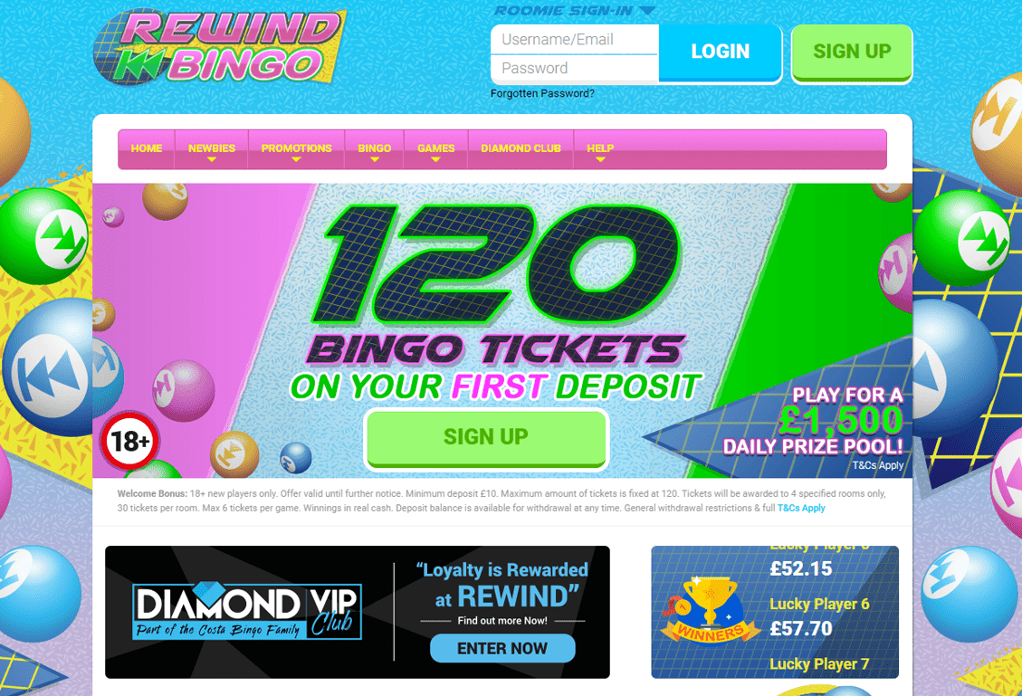 There’s a fabulous bonus on offer to you as a new player at Rewind Bingo for doing nothing more than creating a new account and making a deposit. Once you have made a deposit of £10 or more, you’ll be rewarded with a massive 120 bingo tickets which you can use to play games in four different rooms. Winnings are paid into the real cash balance of your Rewind Bingo account so you won’t need to worry about wagering requirements before you can withdraw your winnings. The prize pool across the free tickets is £1,500 daily and you’ll have lots of chances of grabbing some of the great cash prizes available.